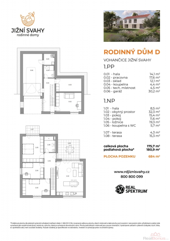 1.PP: hala (14,1 m2), pracovna (17,6 m2), sklad (12,1 m2), koupelna (4,4 m2), technická místnost (4,5 m2), garáž (30,2 m2)