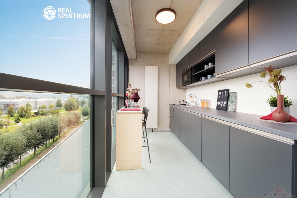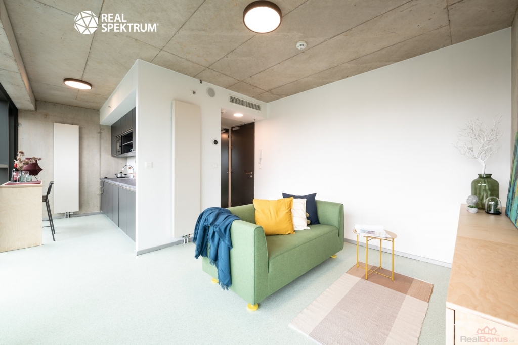 Byt je vybaven a připraven k nastěhování. K dispozici máte kuchyňskou linku (varná deska, digestoř, mikrovlnka, lednice s mrazničkou, myčka), jídelní stůl se židlemi, obývací prostor s pohovkou a komodou.