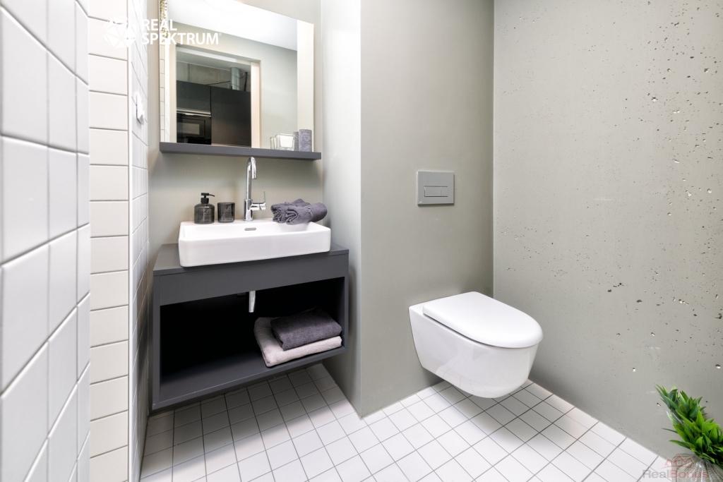 Koupelna je vybavena sprchovým koutem, umyvadlem a toaletou.