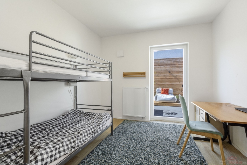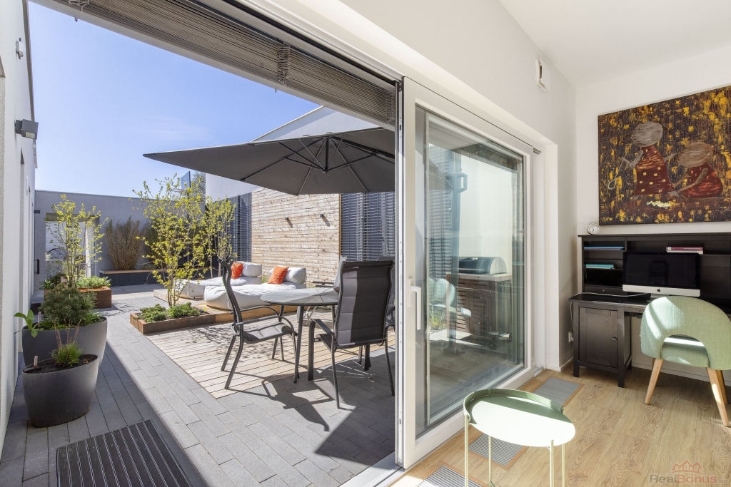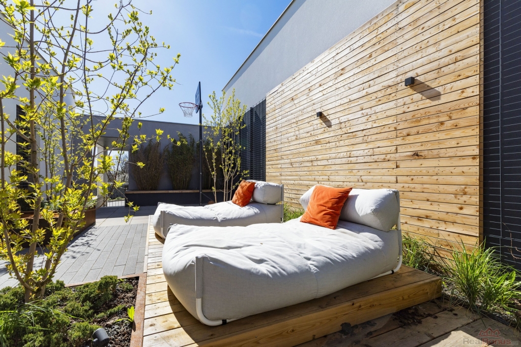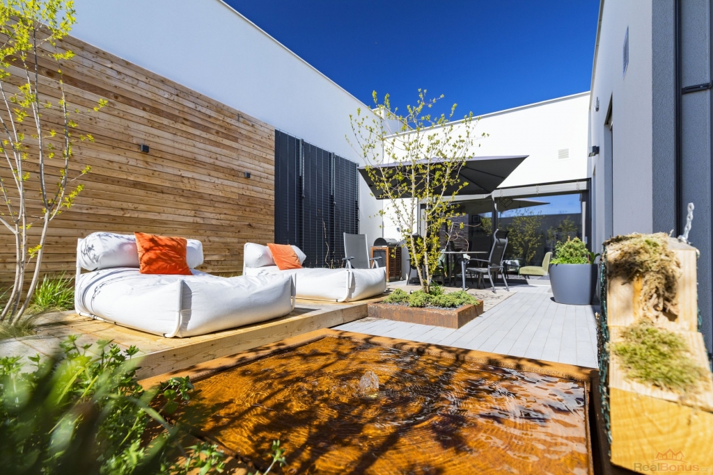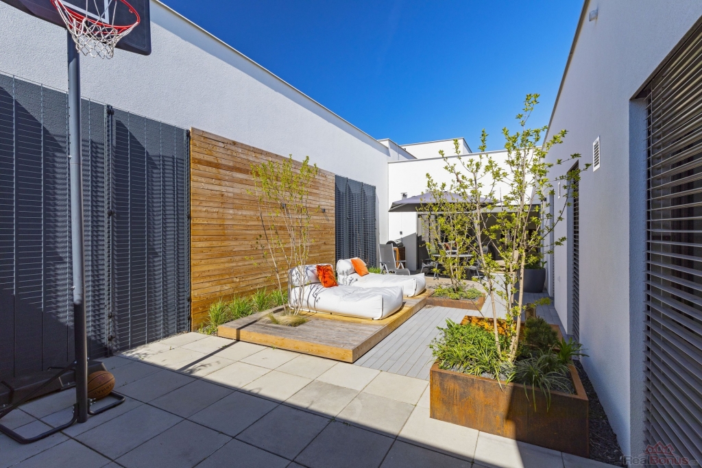 Ve všech pokojích v domě je filtrační rekuperace. V koupelnách jsou nové skříňky pod umyvadlo s úložnými prostory. Dům je vhodný pro rodiny s dětmi i zahraniční klientelu. V domě je také technická místnost, součástí nájmu je i pračka a sušička. Dům je možné si pronajmout nezařízený, nebo po dohodě s majitelkou ponechat část vybavení. Dům je k dispozici od 1. 7. 2026. Venkovní terasa je kompletně zařízená a veškeré vybavení je součástí nájemného.