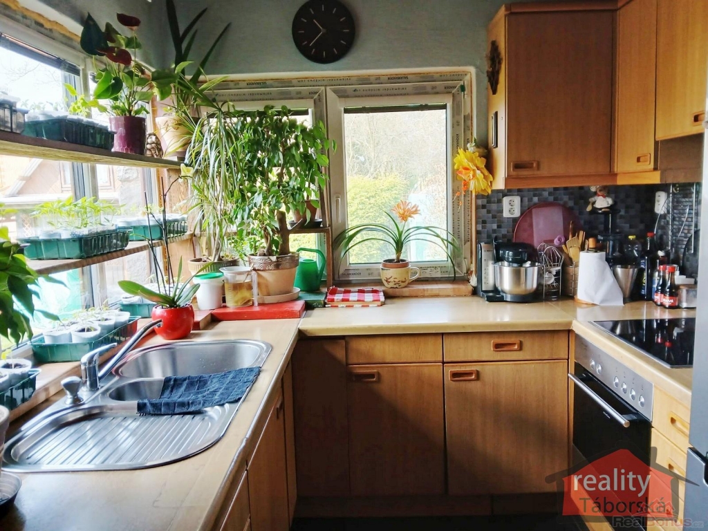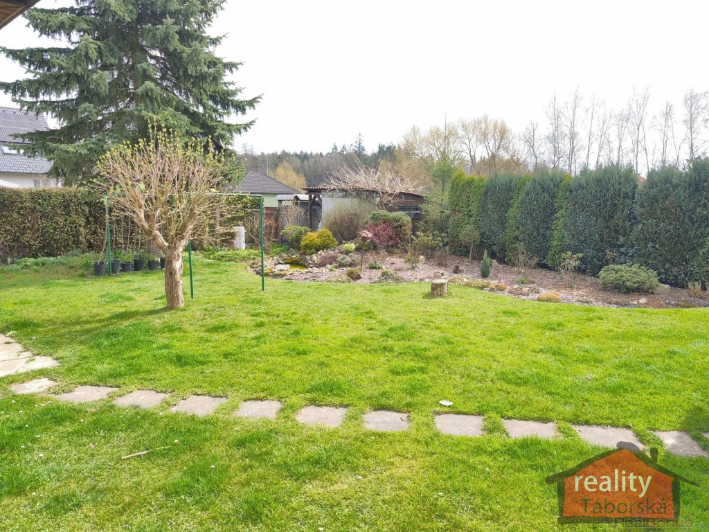 Součástí je pěkná, udržovaná zahrada o výměře 422 m2 se skalkou spojenou s vodopádem, přístřešek pro auto a zahradní altán.