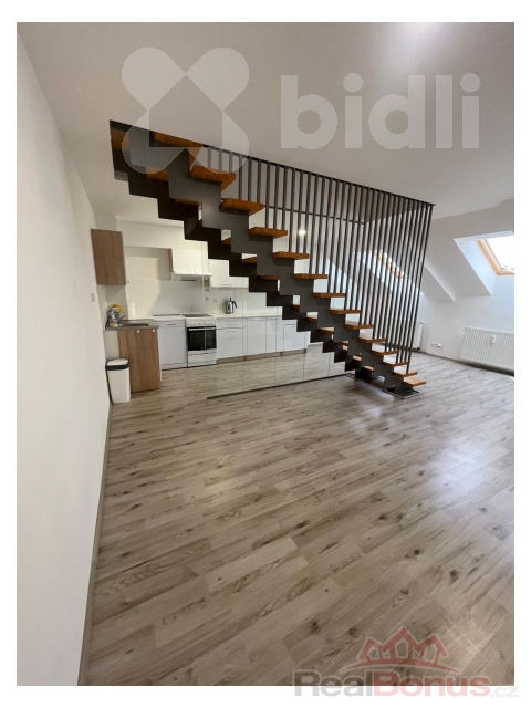 Ve spodním podlaží bytu se nachází prostorný obytný prostor s kuchyňským koutem, který nabízí dostatek místa pro obývací i jídelní část. Dominantou interiéru je schodiště vedoucí do horního patra.
