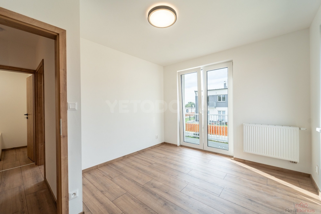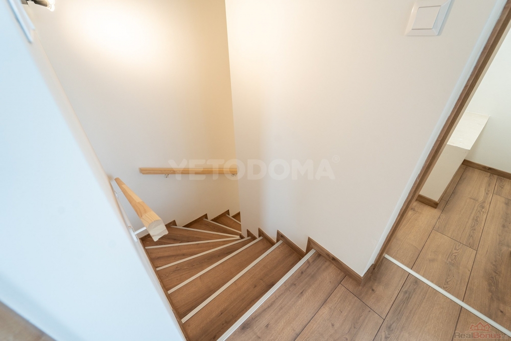 V dolním podlaží je toaleta, technická místnost a prostorný obývací pokoj s kuchyní a vstupem na vlastní zahradu o rozloze 155 m2. V horním patře jsou dva pokoje s balkonem, šatnou a koupelnou.