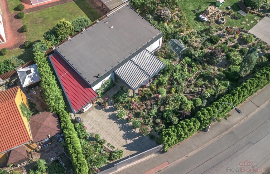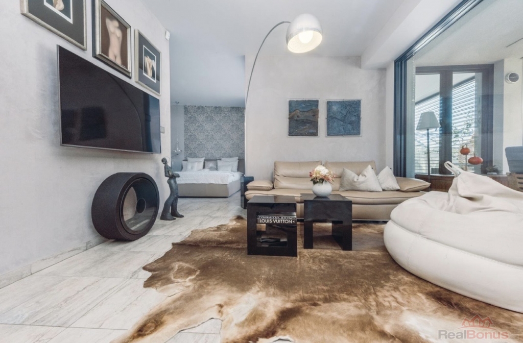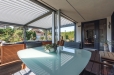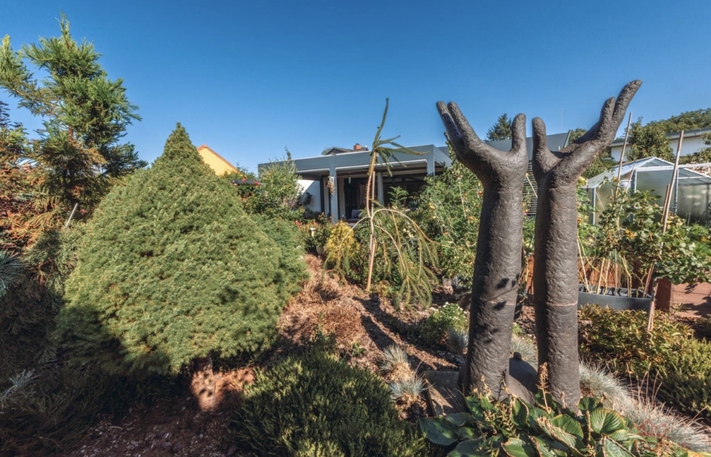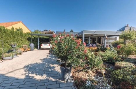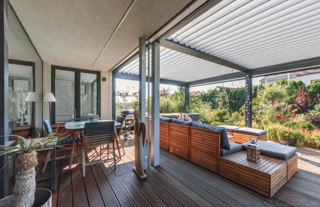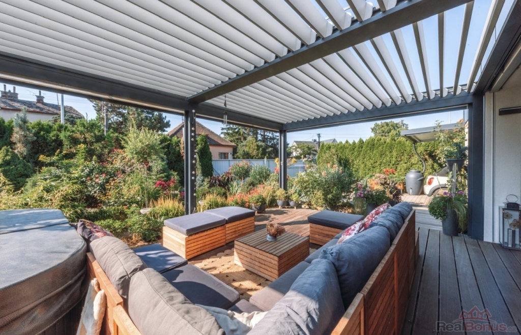 Na obytnou část navazuje krytá terasa s bezúdržbovou bioklimatickou hliníkovou pergolou o rozměrech , která umožňuje využívat venkovní prostor po většinu roku. Do terasy je zabudovaná vířivá vana pro dvě osoby. Pečlivě založená zahrada nabízí dostatek soukromí, klidovou zónu i užitkovou část s ovocnými stromy, skleníkem a zahradním domkem v zadní části domu.