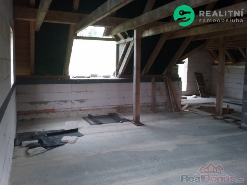 1PP (částečně odkryté mírný svah), 1NP, podkroví, obytná půda. Stavba je z keramických tvarovek s plánovaným zateplením. Stropy Spirol, vnější úprava dle projektu kombinace bílé omítky a dřevěného obkladu s možností změny před dokončením. Střecha s plechovou krytinou (r.2023) 10 let záruka. Podzemní části jsou zatepleny XPS 10 cm a chráněny dvouvrstvou SBS hydroizolací. Komín je stavebnicový s nerezovou vložkou. Interiérové tesařské konstrukce střechy s již hoblovanými vodorovnými nosníky (kleštiny) a podpěrnými trámy, plánované jako pohledové; podbití přesahů střechy na všech štítech hotové s povrchovou úpravou. Dispozice interiéru není dokončena, lze upravit dle vlastních potřeb.