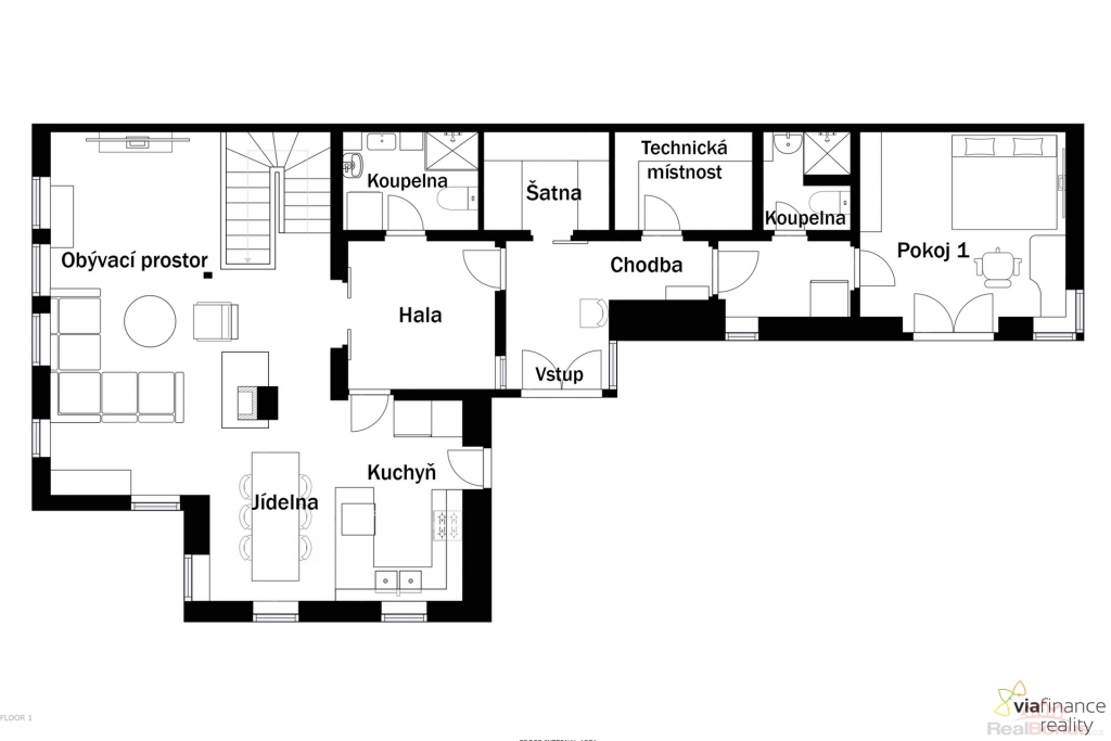 přízemí - vstupní hala, šatna, obývací pokoj, kuchyňský kout, technická místnost(špajz)