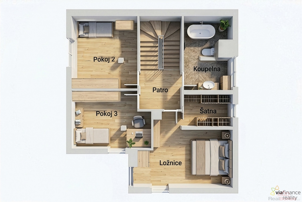 1.NP - ložnice, 2x dětský pokoj, koupelna, wc