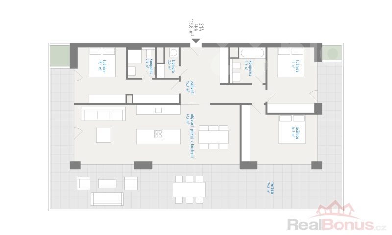 Velikost bytu je 119,8 m2, k bytu navíc náleží prostorná terasa o velikosti 74,8m2, která obklopuje byt ze všech stran. Tento nadstandardní byt tak bude díky velkým oknům krásně prosvětlený, výhodou je také orientace na všechny světové strany, s terasou převážně na jih.