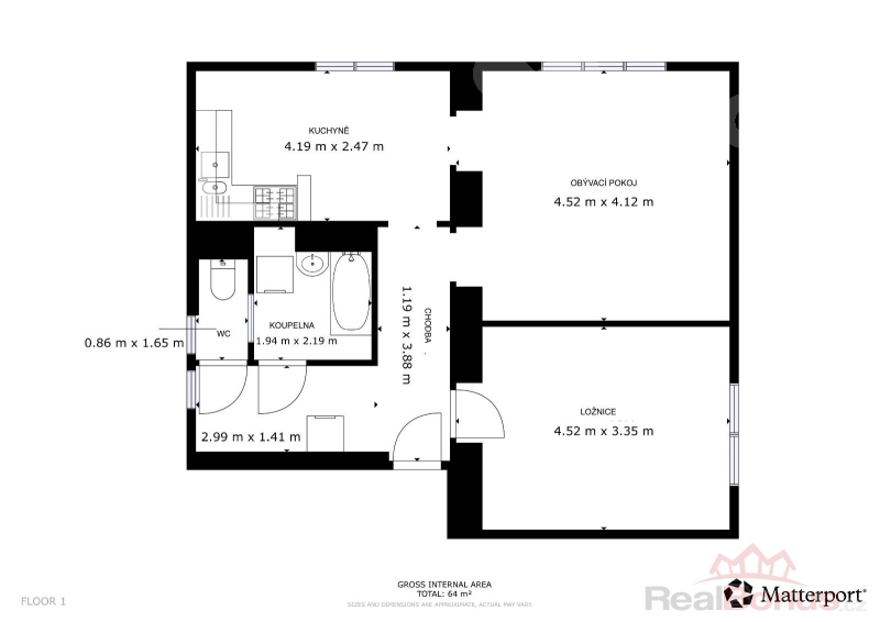 Byt je určen k celkové rekonstrukci, k vytápění slouží plynové gamaty, umístěné v ložnici a obývacím pokoji. V kuchyni jsou funkční kamna na dřevo.