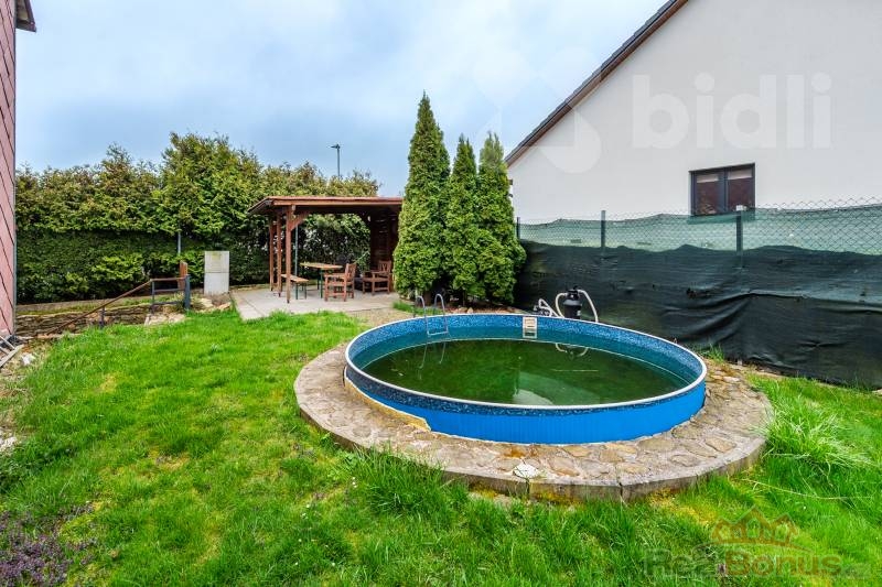 Garáž, sklep, venkovní posezení i zapuštěný bazén.