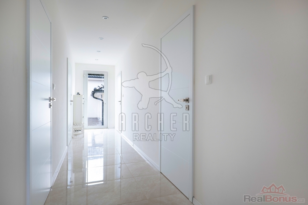 Dům nabízí prostornou vstupní chodbu s vestavěnými skříněmi, s přímým vstupem do přilehlé garáže (1 vůz). Chodba vede do velkoryse řešeného, světlého obývacího pokoje (haly) s plně vybaveným kuchyňským koutem (sklokeramická deska, elektrická trouba, digestoř,