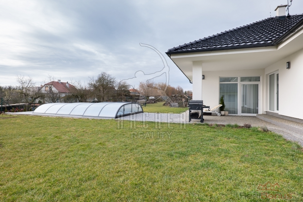Součástí udržované zahrady je zastřešený bazén ( 6 x 3 x 1,5m), 4 parkovací místa na pozemku před vjezdem do garáží.