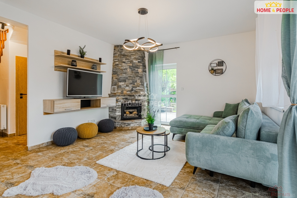 Dominantou domu je světlý a vzdušný interiér, kde každý detail byl pečlivě promyšlen. V obývacím pokoji najdete elegantní krb, který navodí příjemnou atmosféru během chladnějších večerů, a komfortní podlahové vytápění. Dvě velká francouzská okna propojují obývací prostor s krásnou, udržovanou zahradou a zajišťují dostatek přirozeného světla.
