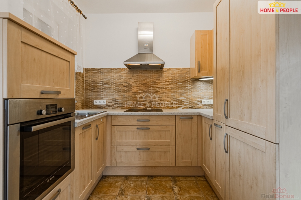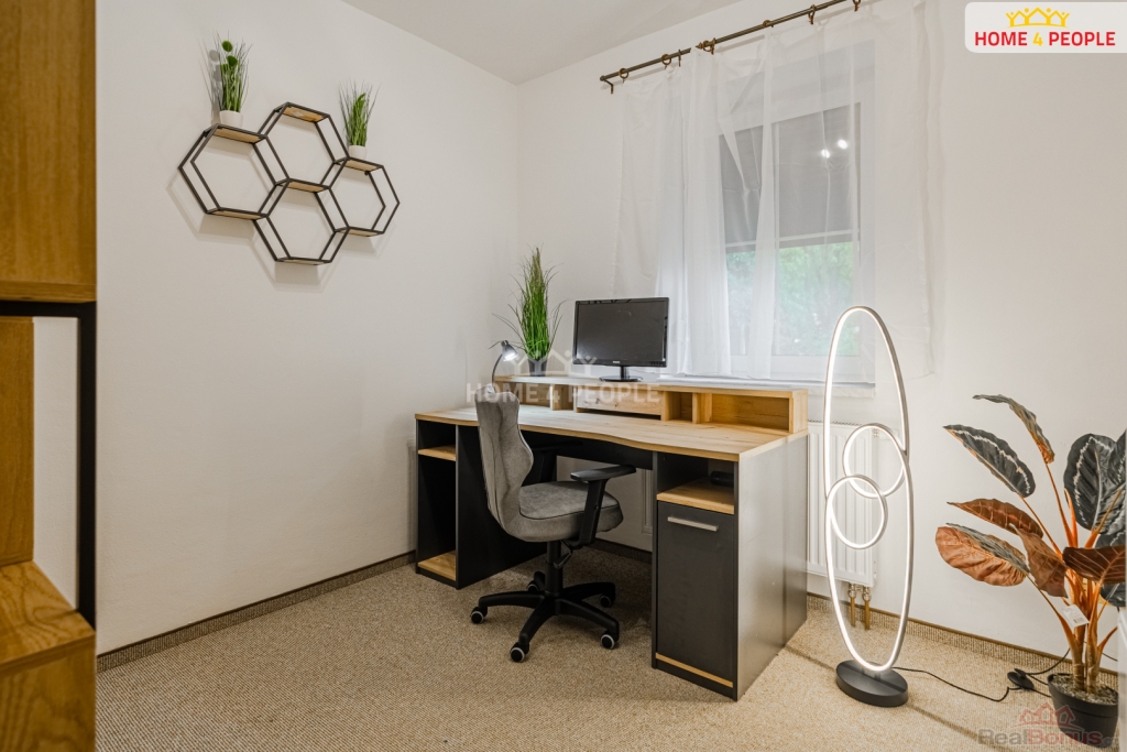 Kuchyně je plně vybavena moderními spotřebiči (myčka, trouba, sklokeramická deska) a navazuje na prostorný jídelní kout ideální pro rodinná setkání. V přízemí se dále nachází koupelna se sprchovým koutem, pracovna s kancelářským nábytkem pro pohodlnou práci z domova a praktická komora s přípojkou na pračku a sušičku.