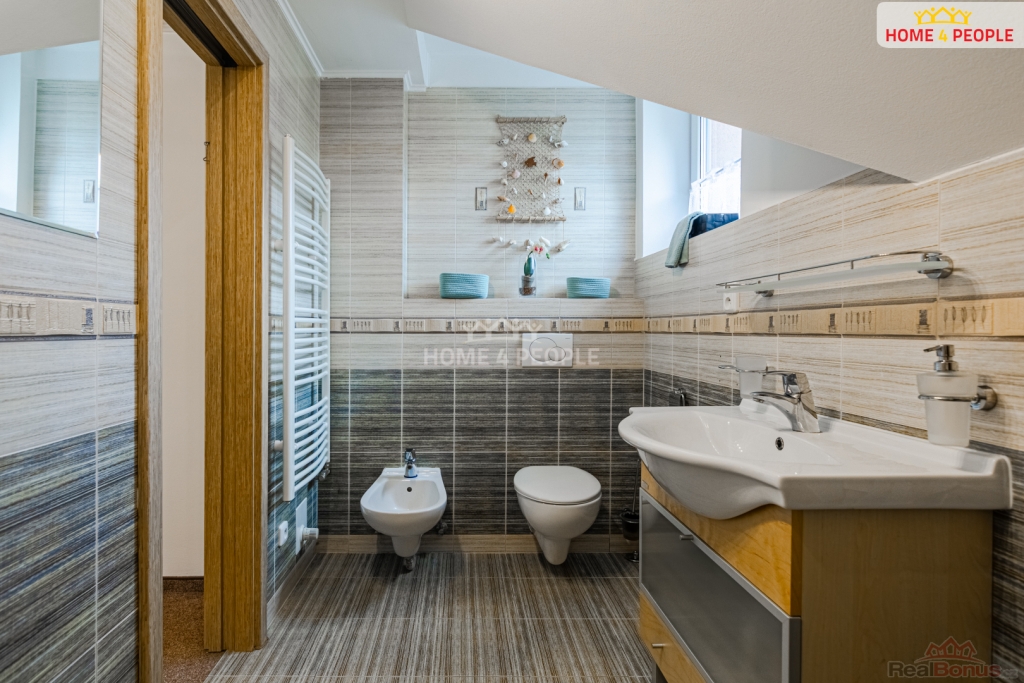 V patře najdete tři samostatné pokoje, z nichž dva mají psací stůl. Nechybí zde ani prostorná šatna a druhá koupelna s rohovou vanou, bidetem a toaletou. Ze dvou pokojů je přímý vstup na velký balkón. Většina oken je opatřena předokenními roletami.
