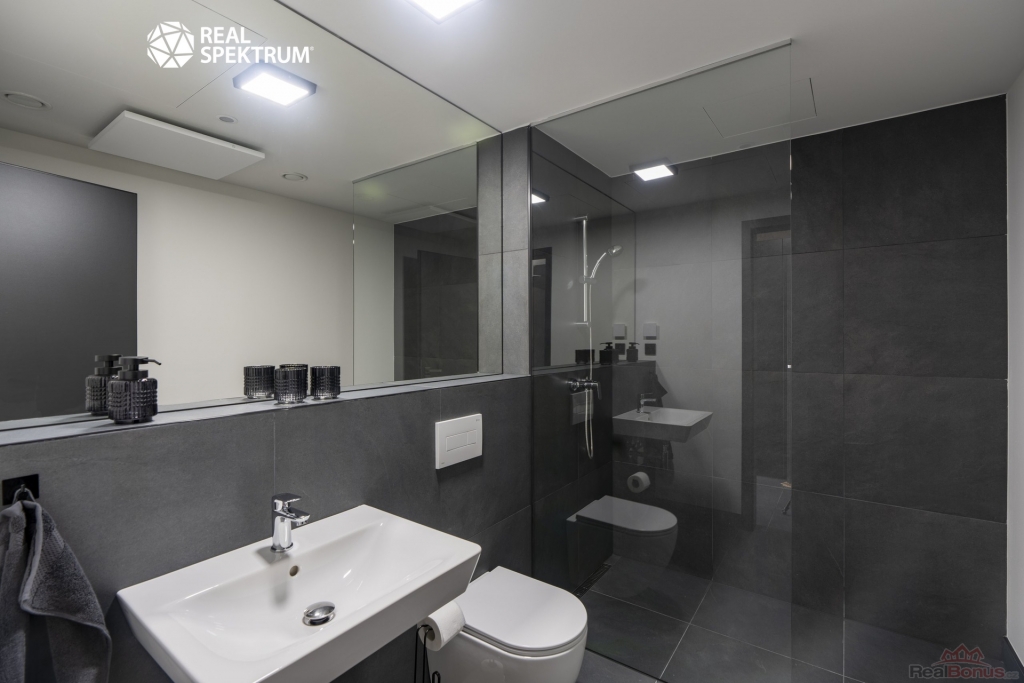? moderní koupelna se sprchou, umyvadlem a WC