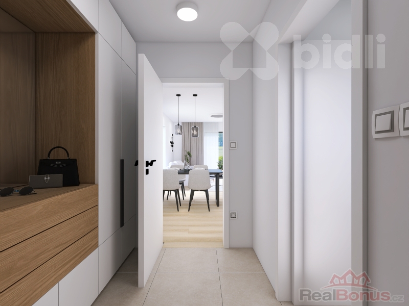 Nabízíme k prodeji moderní bytovou jednotku o dispozici 3+kk a podlahové ploše 85,5 m2, která se sestává z 1 nadzemního podlaží a podkroví komorního trojdomu v rámci developerského projektu v obci Dýšina.