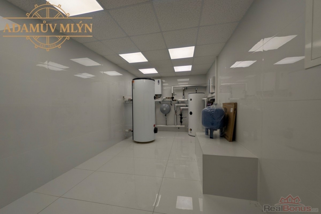 Suterén je prosvětlen okny do anglického dvorku. Přímo za zdí proudí mlýnský náhon ? zvuk vody máte zdarma k sauně, vířivce, vinnému sklepu nebo prostoru pro odpočinek.