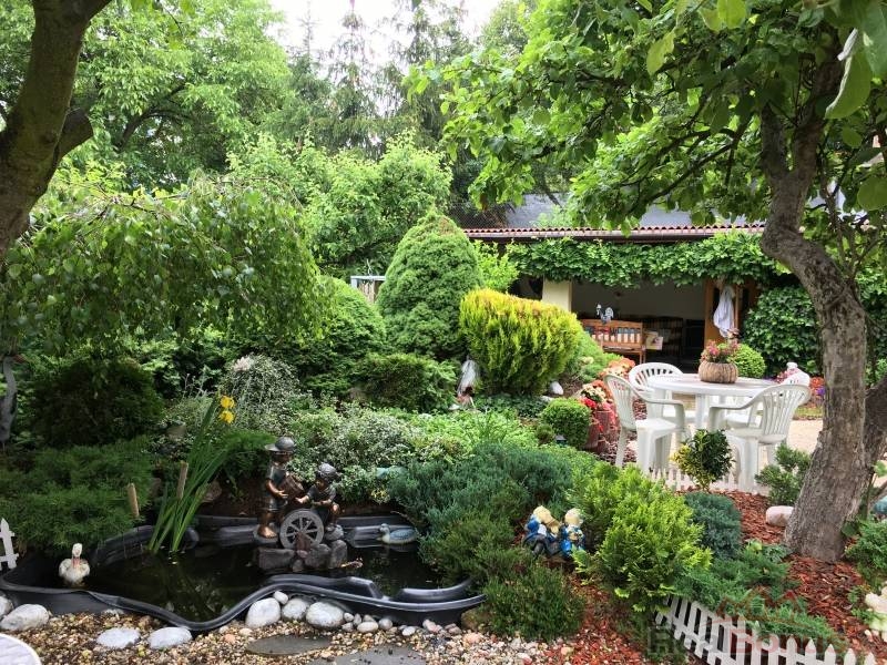 Za domem velice vkusná a bohatá okrasná zahrada s ovocnými stromy a okrasnými dřevinami . Letní kuchyně s pergolou, včetně přípojky vody a el.