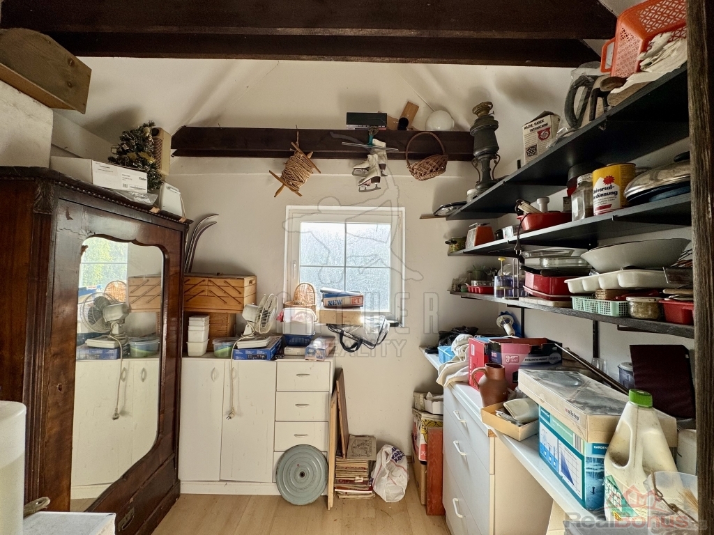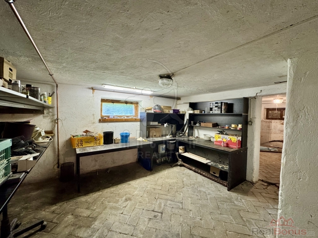 Sklep je rozlehlý, má 59m2 ve třech místnostech. Je prosvětlený okny, je zde regál na vína, dílna a místnost s kotlem.