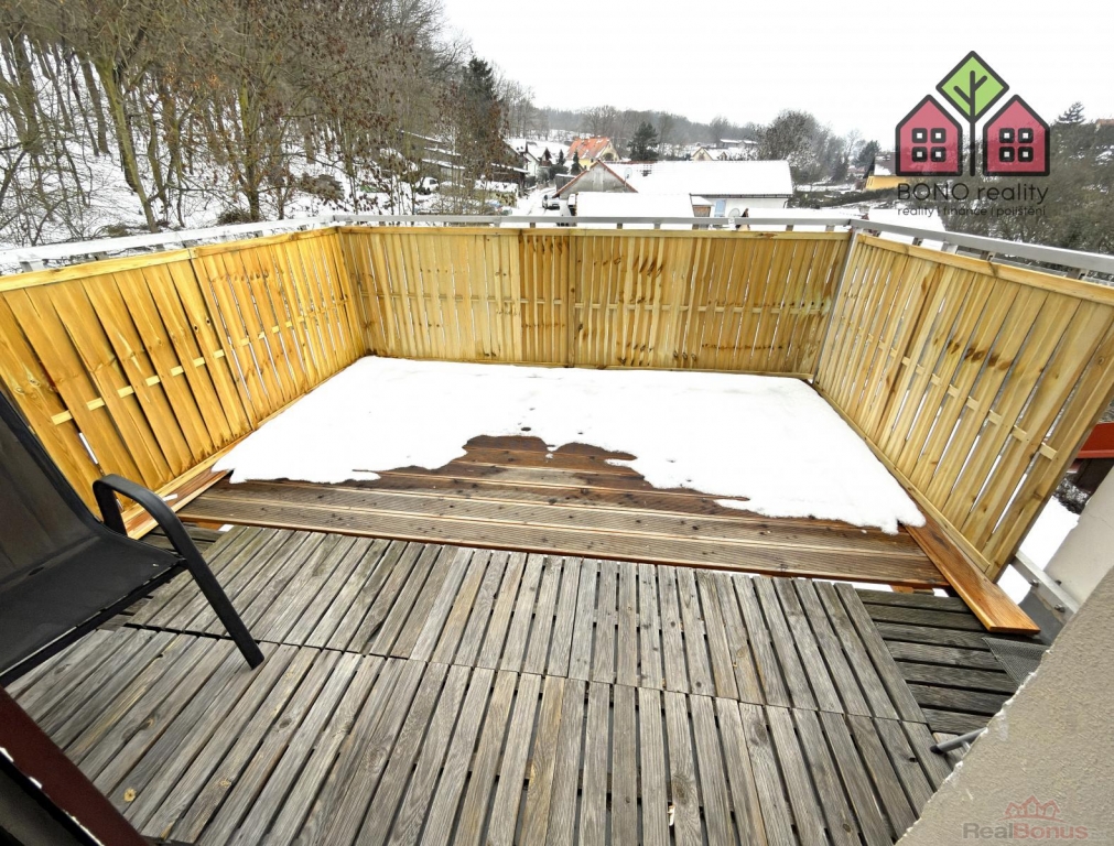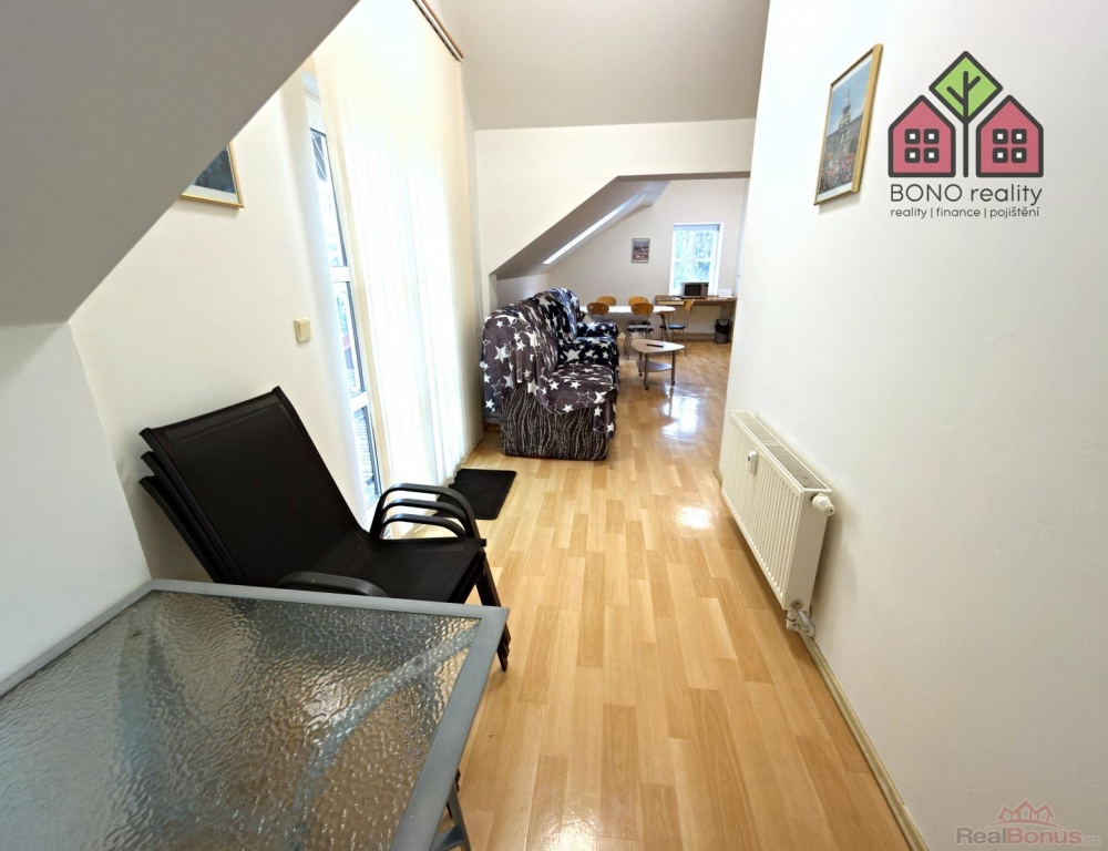 Interiér: Světlý podkrovní prostor s terasou (10,68 m and sup2;) a výhledem do přírody.