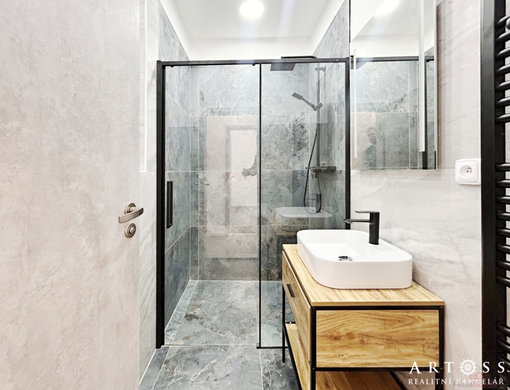 Technologie: Podlahové vytápění v celém bytě zajišťuje vysoký tepelný komfort. Ohřev vody a vytápění je společné, byt má však vlastní podružné měřiče elektřiny i vody (teplá/studená) pro přesné vyúčtování.