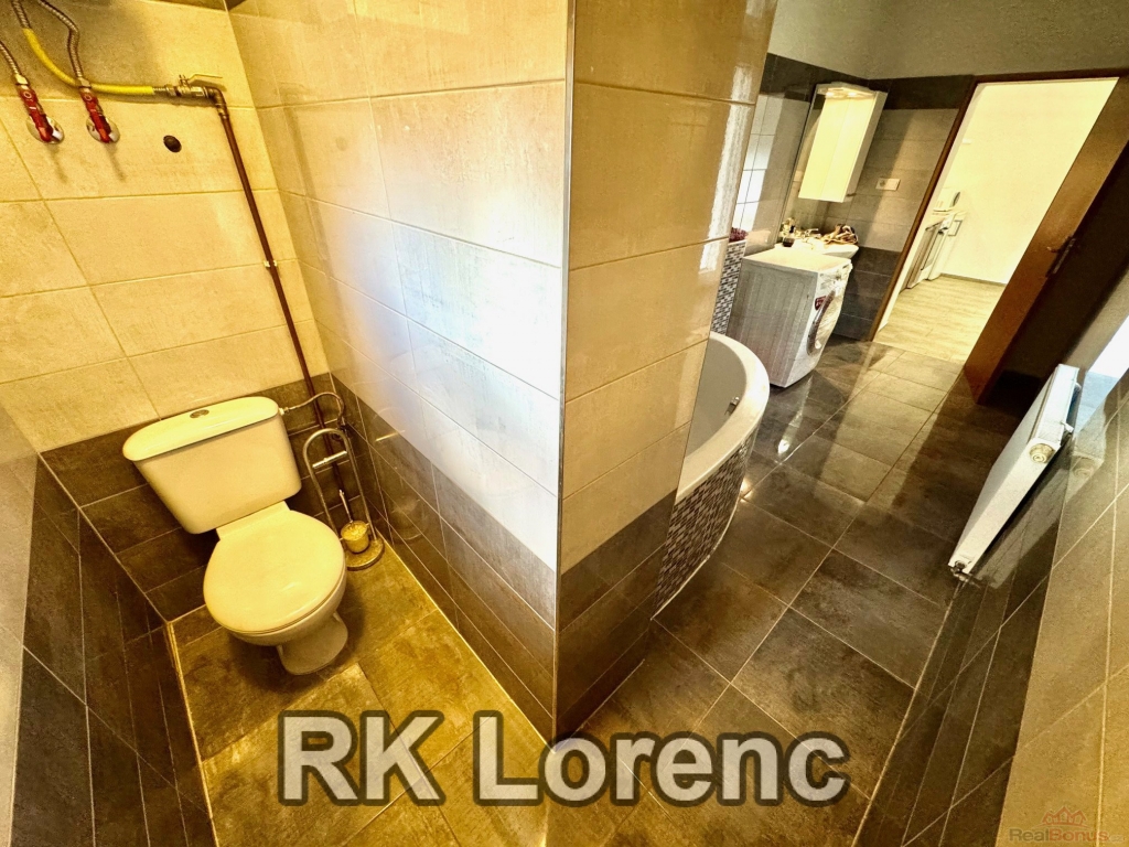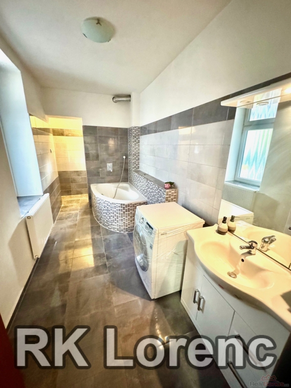 Dispozice: přízemí - uzavřená průchozí garáž 21.7 m2 na zahradu, dále byt 2+kk kde se nachází chodba 9 m2, komora 2.4 m2, obytná kuchyně 11.6. m2 se vstupem na dvůr se zahradou, koupelna s rohovou vanou 7.7 m2 a toaletou 1.6 m2, samostatný pokoj 19 m2 do jednosměrné ulice.