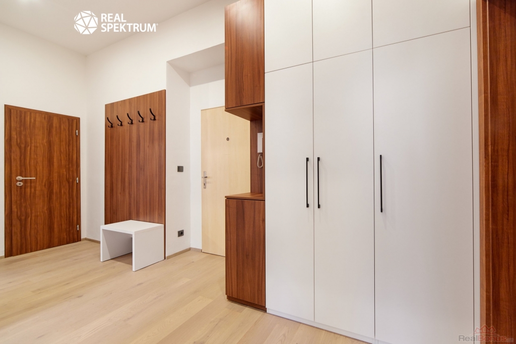 Tento stylový byt se nabízí plně vybavený, kde máte k dispozici moderní kuchyňskou linku se spotřebiči (indukční deska, trouba, digestoř, mikrovlnka, myčka lednice s mrazničkou), jídelní stůl, židle, obývací prostor se sedací soupravou, konfe. stolkem, tv stěnou a TV. Byt má k dispozici dvě oddělené vybavené ložnice a každá z nich má manželskou postel, pracovní stůl, skříň a úložné prostory. Další úložné prostoty jsou ve vstupní chodbě a v šatně.