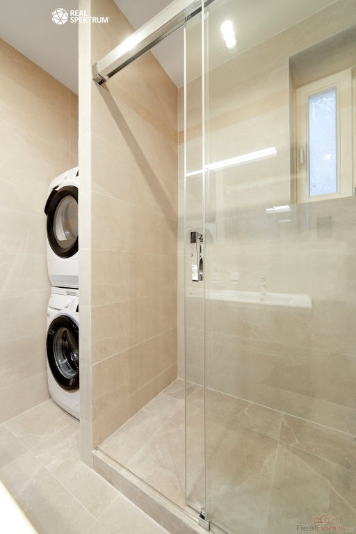Koupelna je vybavena sprchovým koutem, dvěma umyvadly, pračkou a sušičkou. Toaleta je oddělena.