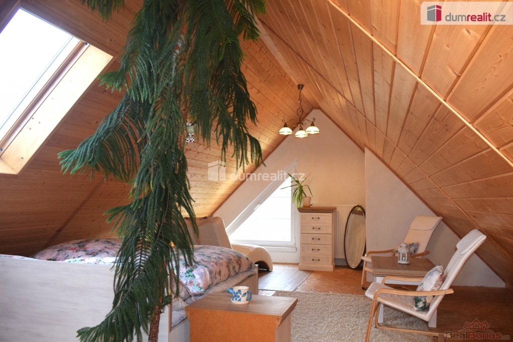 Podkroví - velká zateplená místnost, která je obložena dřevem, s krásným výhledem na Vyskeř.