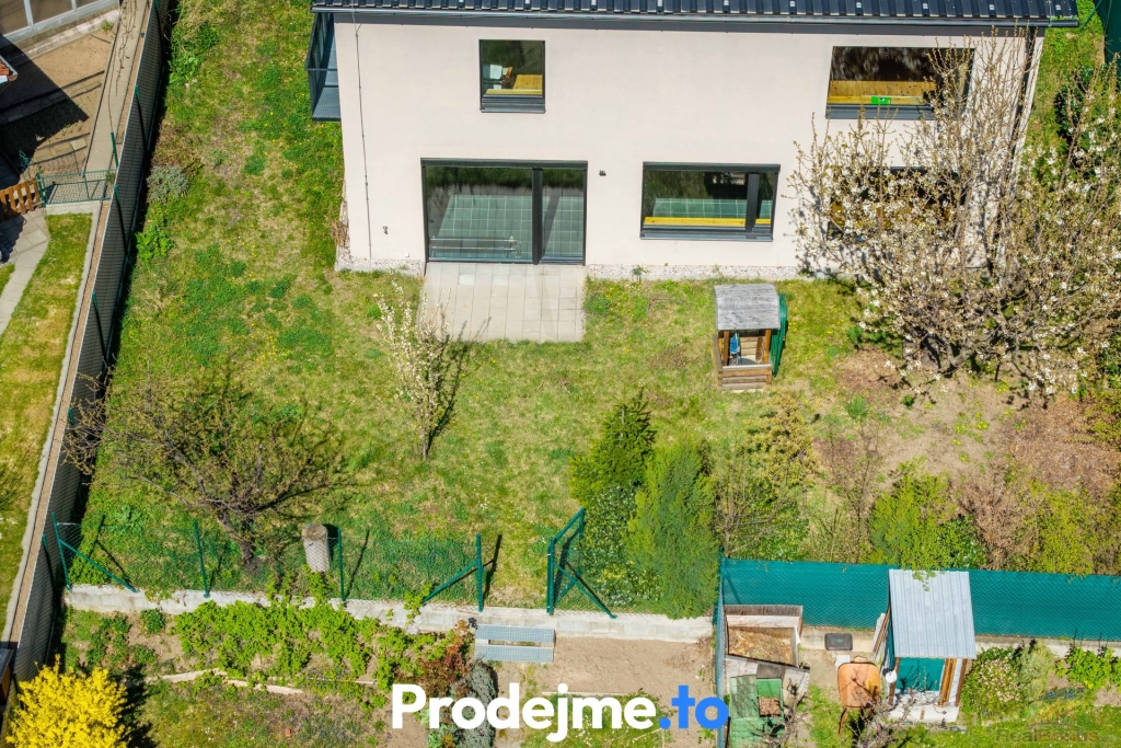 Pozemek má výměru 395 m2 a zahrada je orientovaná do klidného vnitrobloku. Díky svahovitému terénu přirozeně vytváří několik úrovní pro relaxaci i zahradničení. Soukromí na terase (10 m2) umocňují vzrostlé stromy. Parkování pro dva vozy je zajištěno na pozemku za dálkově ovládanou el. bránou.