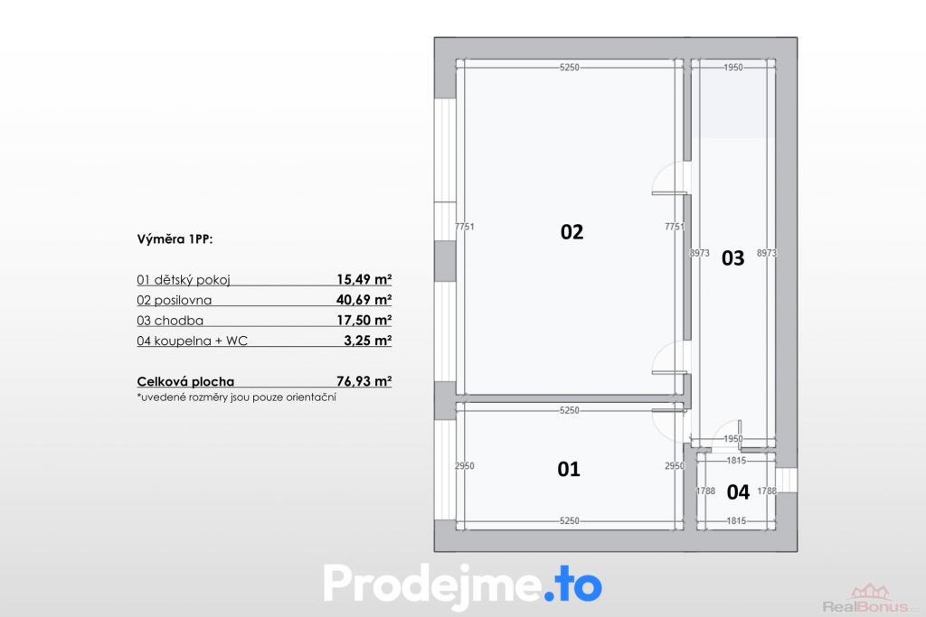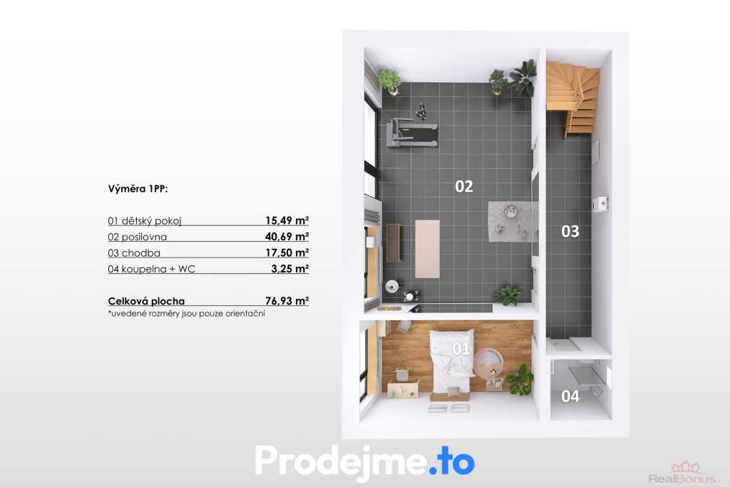 V přízemí domu najdete dětský pokoj a nadstandardně velkou místnost o velikosti téměř 40 m2. Prostor je natolik velkorysý, že bez problémů pojme pracovnu, dětský koutek i domácí fitness. Spodní patro doplňuje druhá koupelna se sprchovým koutem a toaletou a prostorná chodba opět s místem pro šatnu.