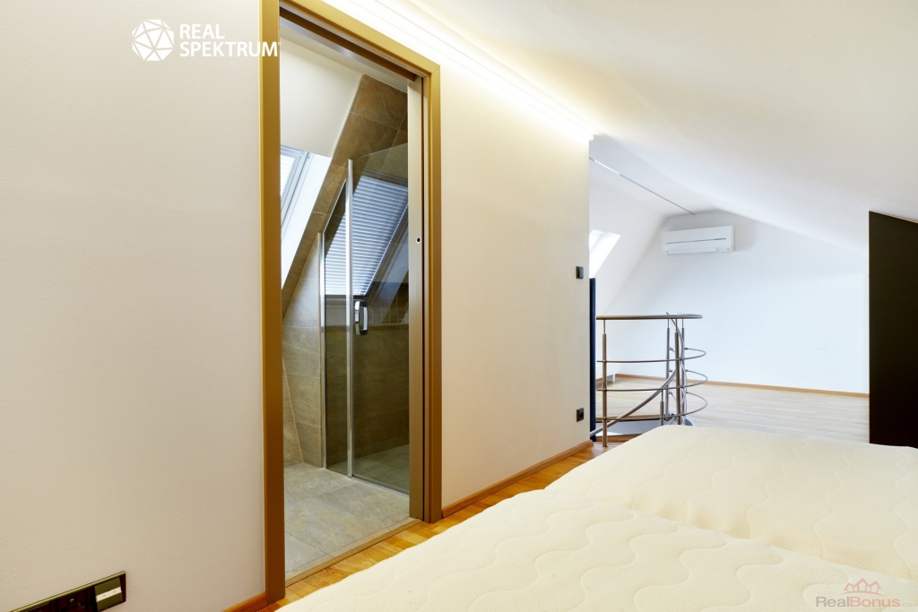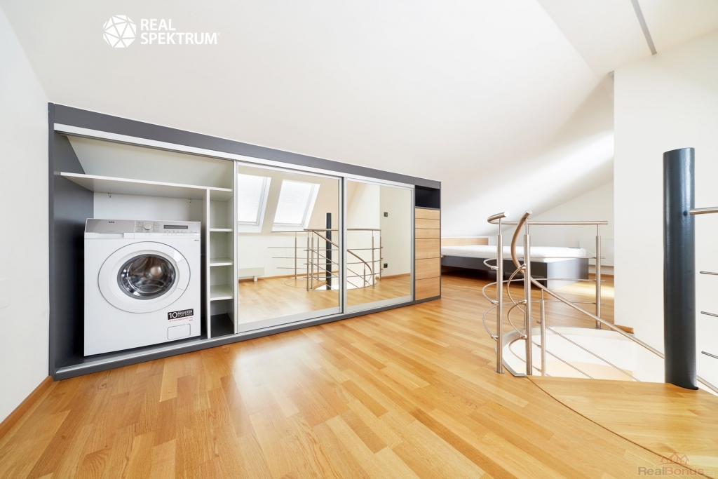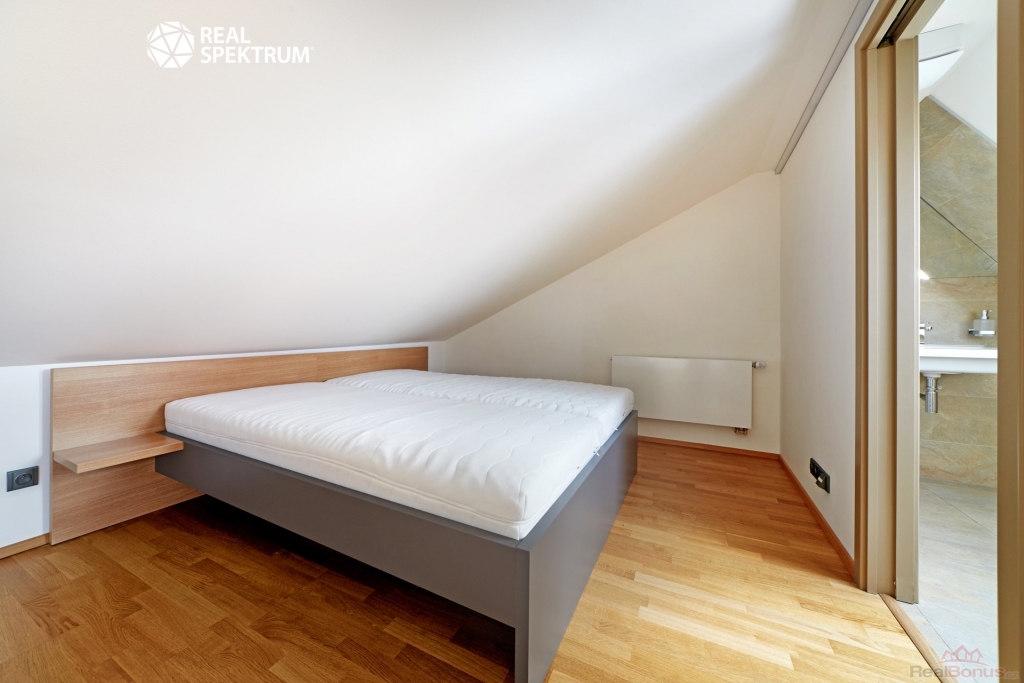 Ložnice se nachází ve druhém patře a ze jde umístěna manželská postel, noční stolky a úložné prostory s pračkou.