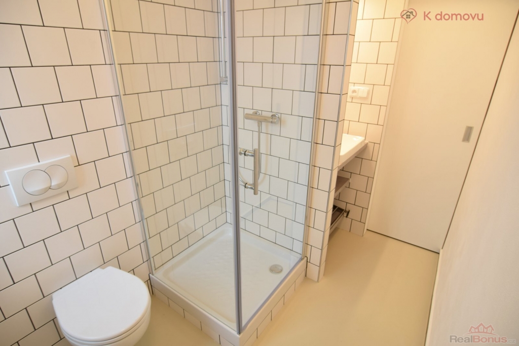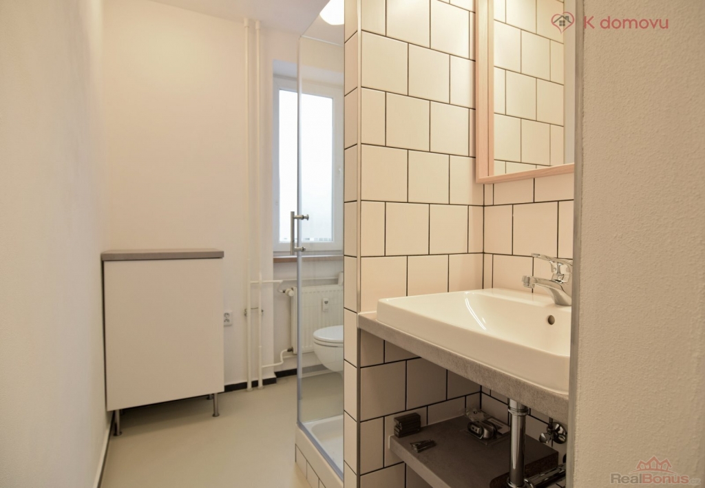 Koupelna se sprchovým koutem, umyvadlovou skříňkou se zrcadlem a přípojkou na automatickou pračku.