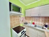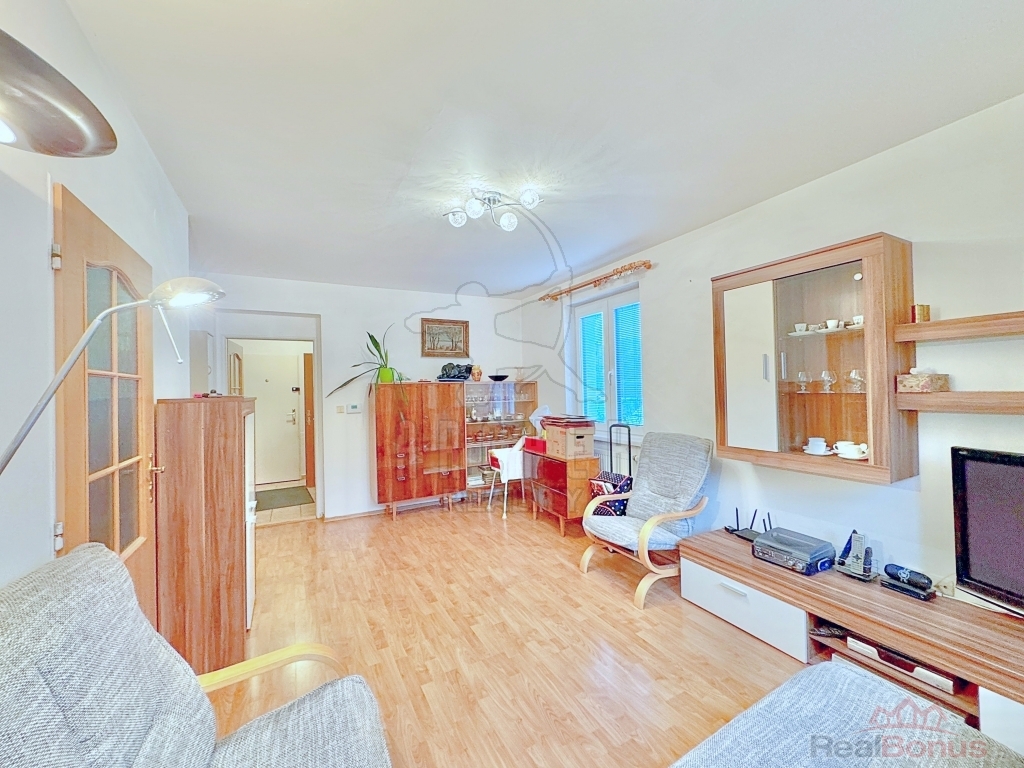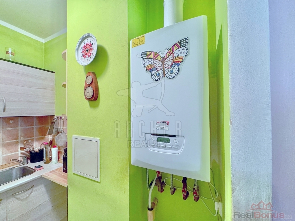 Obývací pokoj je prosvětlený ze dvou stran a je průchozí do ložnice a malé kuchyně, vybavené sporákem se sklokeramickou deskou, lednicí s větším mrazákem, mikrovlnkou a kuchyňskou linkou. V ložnici je velká skříň s posuvnými zrcadlovými dveřmi.