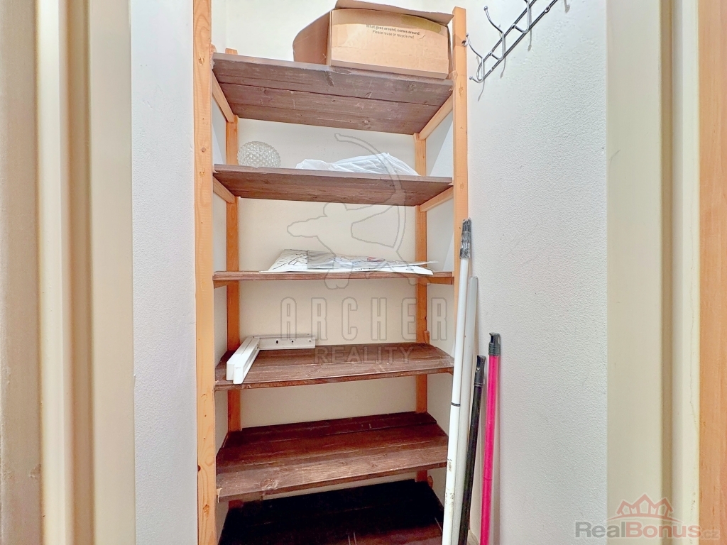 Koupelna je prostorná a je vybavena velkým sprchovým koutem, umyvadlem, toaletou, pračkou a sušičkou. K bytu náleží komora.
