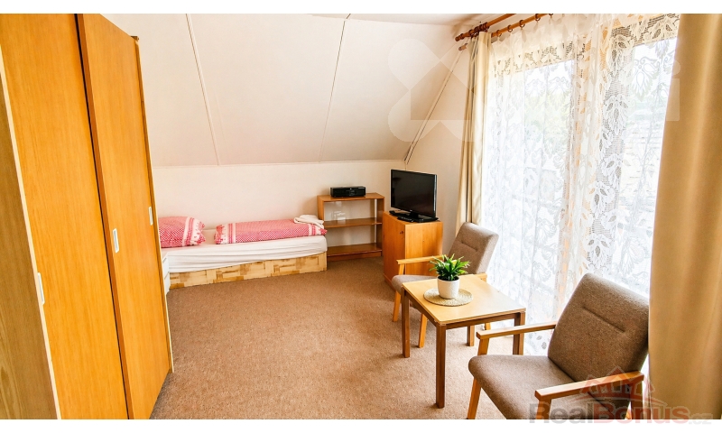 Jedná se o podkrovní byt, který je jedinou bytovou jednotkou v podkroví domu, zatímco v prvním nadzemním podlaží se nacházejí další dva byty. Dispozičně je byt řešen tak, že po vstupu po schodišti se dostanete do centrální části bytu, kde se nachází kuchyně. Kuchyně tvoří hlavní obytný prostor uprostřed bytu, odkud je přístup do jednotlivých pokojů - vlevo se nachází větší pokoj a z druhé strany menší pokoj. Součástí bytu je koupelna se s vanou a toaletou. Byt je vybaven dle fotografií, lze vystěhovat nábytek dle potřeb nájemce. Dům je zateplen a vybaven novými okny, což přispívá k příjemnému a úspornému bydlení. K domu náleží vlastní parkoviště, pozemek není oplocen.