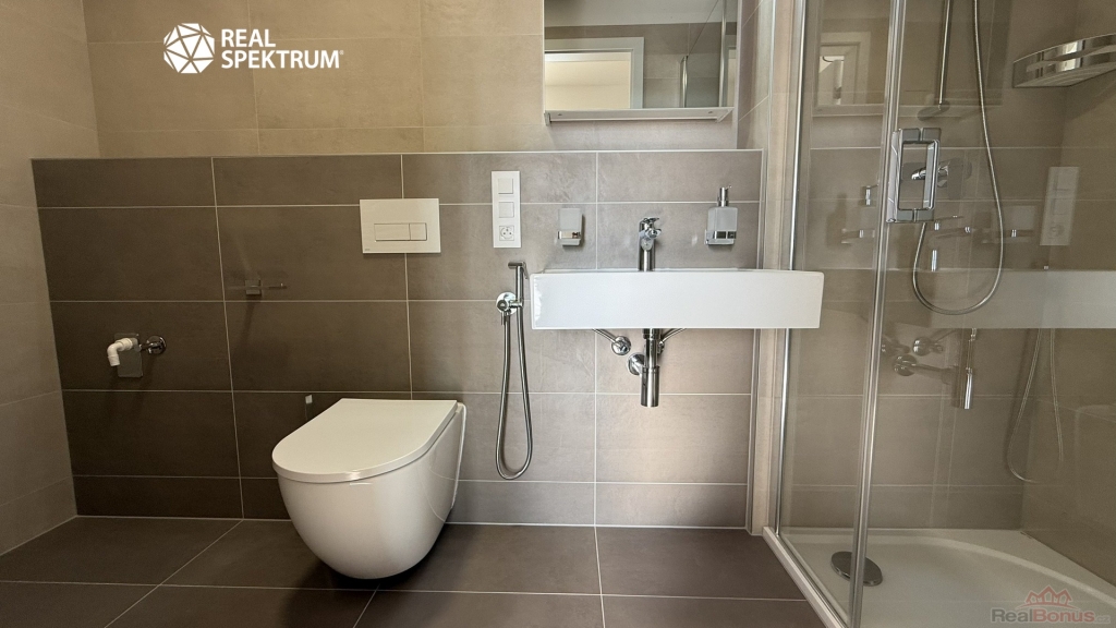 Dále je k dispozici samostatná ložnice s prostorem pro vestavné skříně a koupelna se sprchovým koutem a toaletou s bidetovou sprškou.