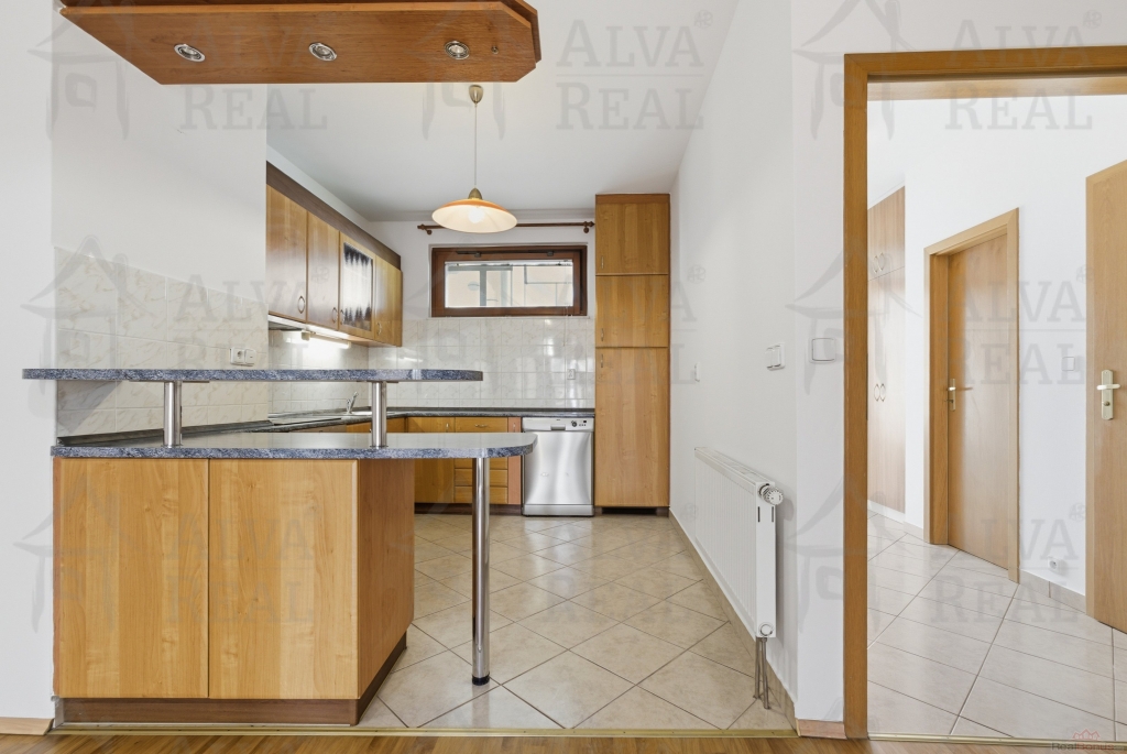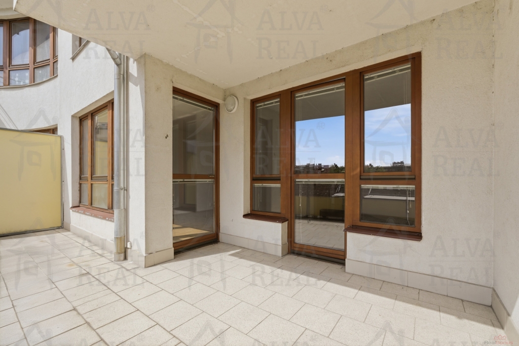 Do bytu se vstupuje z atria budovy, sestává se z komory, samostatného WC, prostorné koupelny s rohovou vanou i sprchovým koutem. Dále vybavená kuchyňská linka vč. spotřebičů (čtyřbodová varná deska, el. trouba zn. Gorenje, vestavěná lednice a mrazák, myčka zn. Zanussi). Předností tohoto bytu je terasa, na kterou je vstup z obývacího pokoje i z ložnice. Obě dvě místnosti jsou krásně prosvětleny a terasa vytváří přirozené odhlučnění.