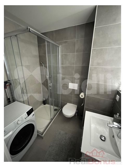 koupelna se sprchovým koutem a pračkou