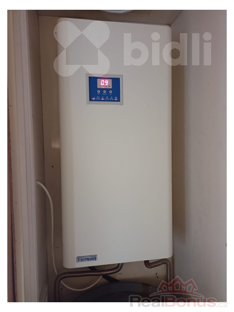 Ve střední části je technická místnost s elektrickým kotlem Thermona, který zajišťuje vytápění radiátory a bojler na ohřev vody. Dále zde najdete chodbu, koupelnu se sprchovým koutem, umyvadlem, WC a koupelnovou skříňkou. Další pokoj-dvě postele a vestavěná skřín.
