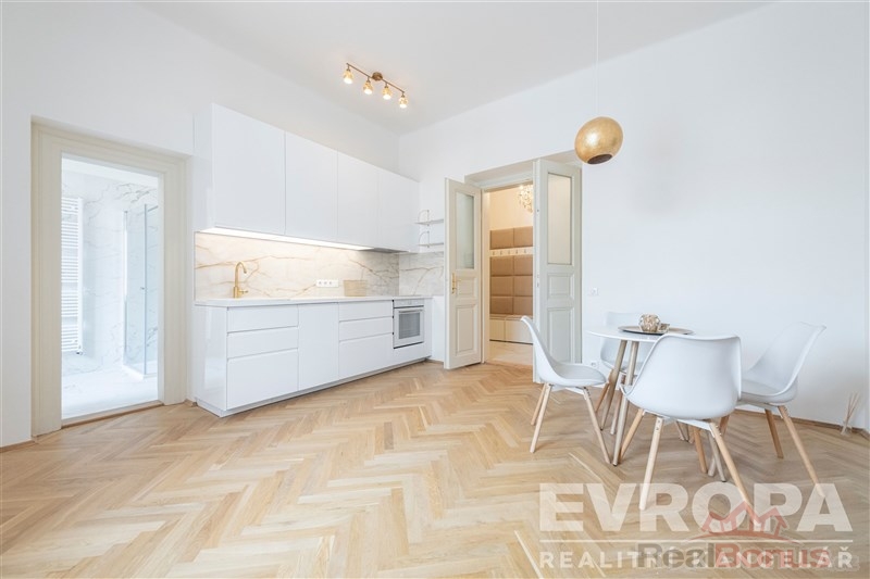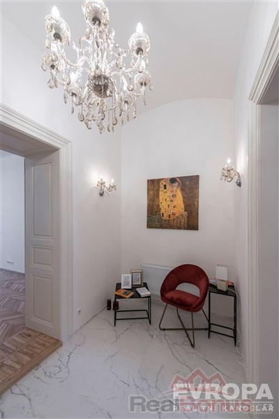 Kompletní rekonstrukce bytu dala vyniknout kráse původních architektonických prvků jako jsou dvoukřídlé interiérové dveře, parkety, velká špaletová okna a ostatní dobové doplňky. Velkoformátová dlažba z italského bílého mramoru, křišťálové lustry a nádherné vstupní dveře podtrhují výjimečnost a krásu tohoto bytu. Teplo a ohřev vody zajišťuje nový plynový kotel. V celém bytě je zavedena kabelová, internetová a telefonní síť. Zcela nová je elektroinstalace, koupelna, WC a rozvod topení. Byt má zcela nově zařízený interiér s moderní kuchyní.