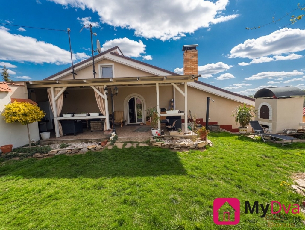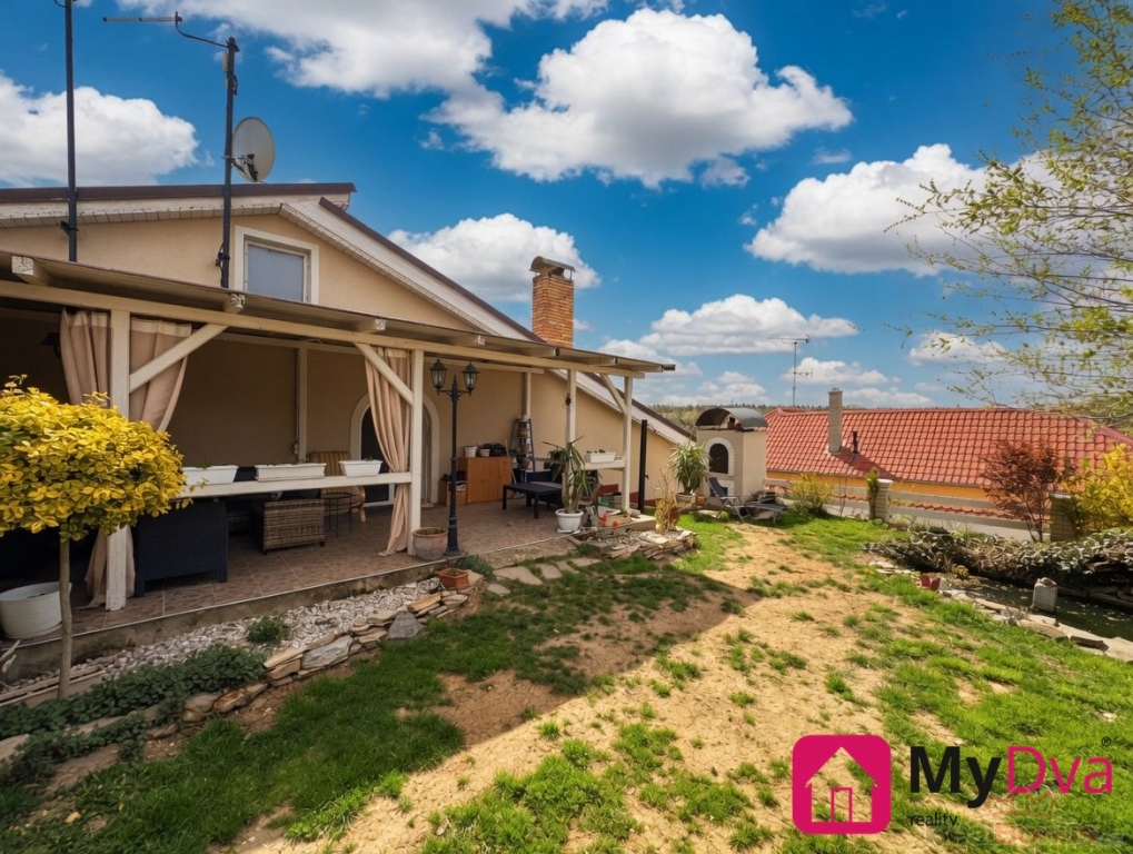 Exteriér domu je stejně působivý jako jeho interiér. Udržovaná zahrada nabízí harmonické spojení zeleně, okrasného jezírka a relaxačních zón. Pergola navazující na kuchyni vybízí k letnímu posezení, zatímco druhá terasa přístupná z obývacího pokoje poskytuje další prostor pro odpočinek. Celý pozemek je citlivě ohraničen zděným plotem, který zajišťuje absolutní soukromí.