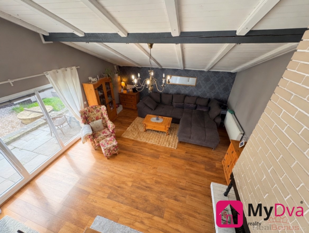 Dominantou domu je vzdušné hlavní podlaží, kde se přirozeně propojuje design, komfort a funkčnost. Elegantní kuchyně vybavená moderními spotřebiči plynule navazuje na jídelní část a reprezentativní obývací prostor s otevřeným krbem, který vytváří jedinečnou atmosféru domova. Odtud je přímý vstup na terasu, ideální pro relaxaci i společenská setkání. Dále se zde nachází tři samostatné pokoje, koupelna s vanou, samostatné WC a praktické zázemí v podobě komory.