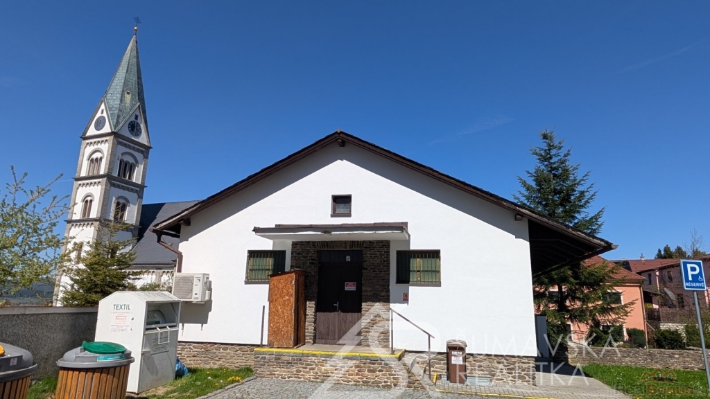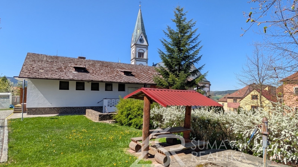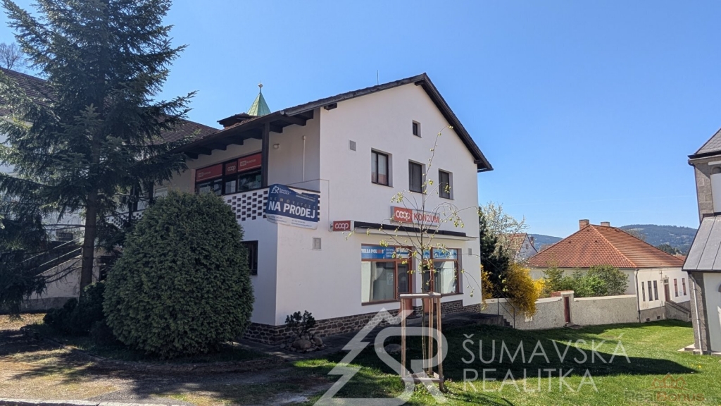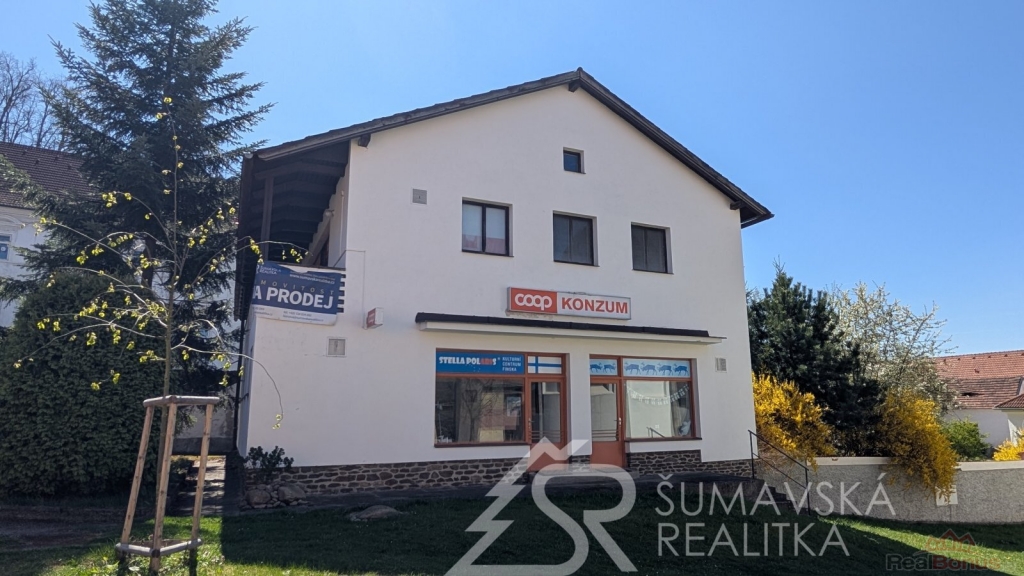 Popis: přímo v centru obce a to mezi kostelem a zámkem se nachází zavedená prodejna potravin. Jedná se o dvoupatrový objekt občanské vybavenosti, kdy v přízemí je jeden nebytový prostor (bývalá masna) který nyní sloužil jako kulturní centrum. V patře je pak rozsáhlý obchod se sklady a zázemím. Budova je klasicky zděná se sedlovou střechou. Celková podlahová plocha je 330 m2. Výhoda je dobré umístění v centru obce s vynikající dopravní obslužností, parkovacími místy a v těsném sousedství autobusové zastávky.