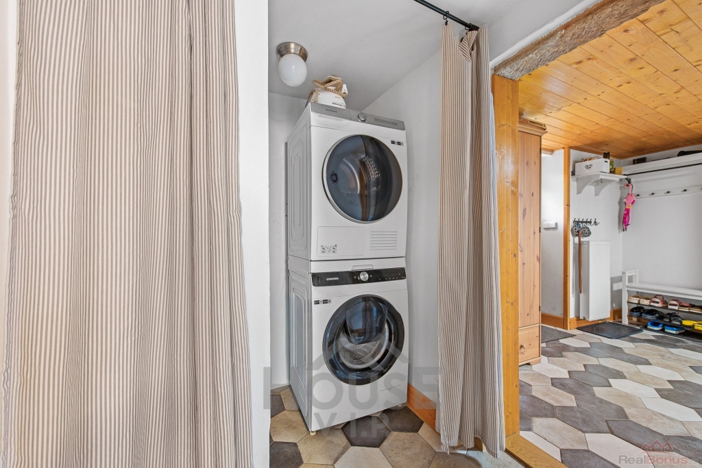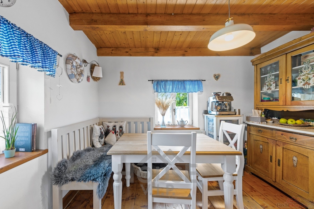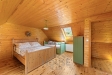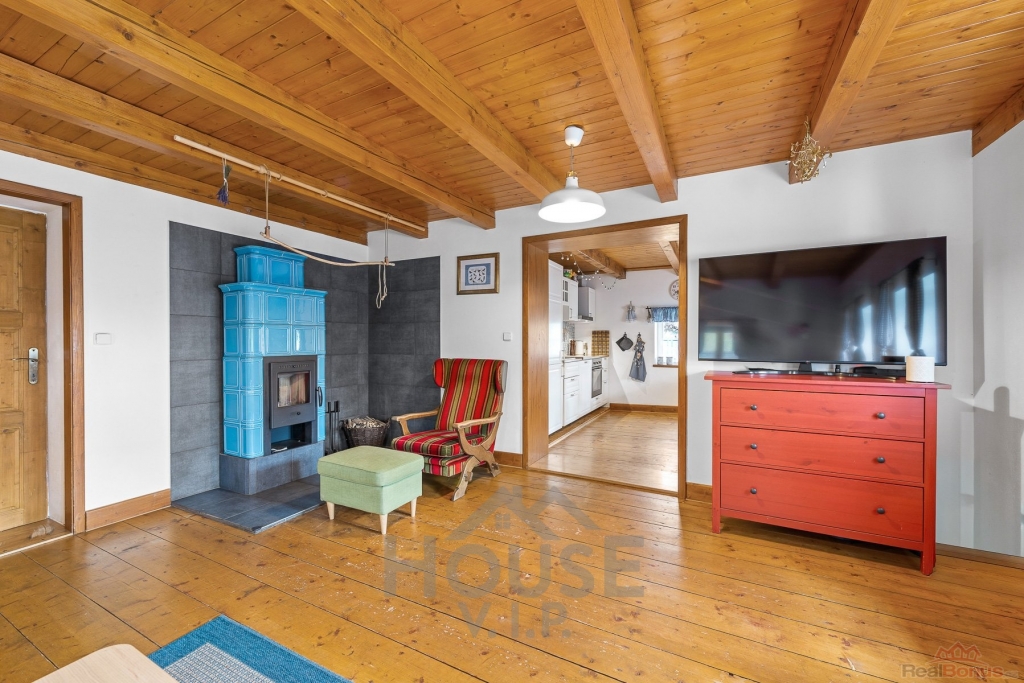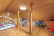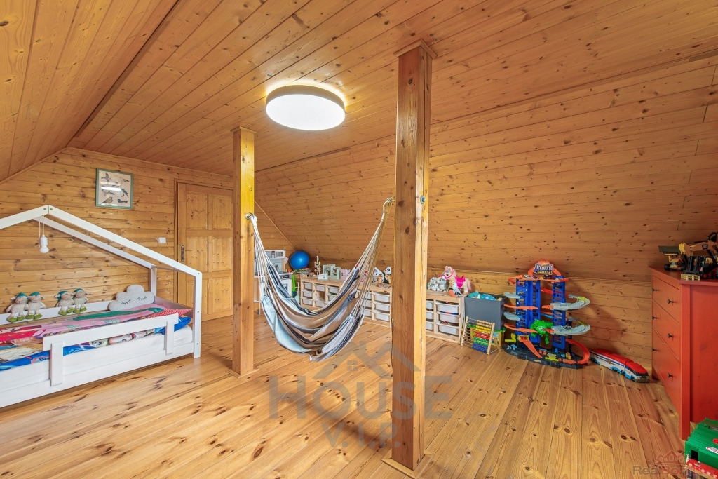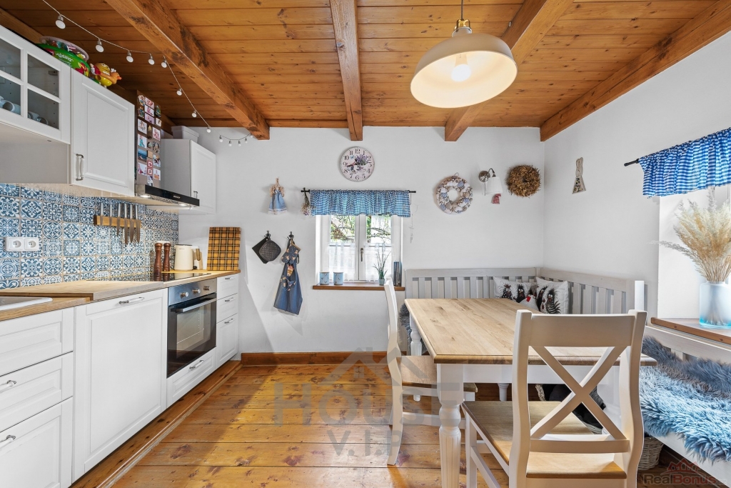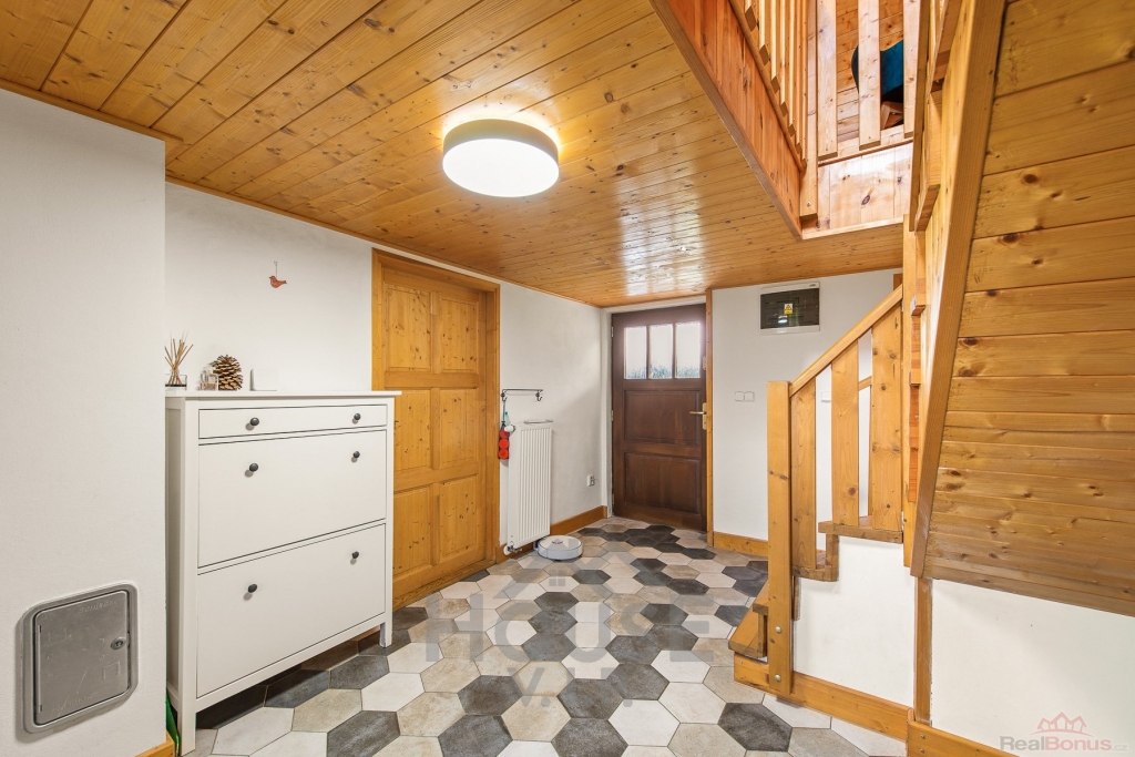 Ve druhém podlaží jsou dvě prostorné ložnice a velká hala, kterou lze využít jako odpočinkovou zónu nebo pracovnu. Interiér působí velmi útulně a vkusně ? dřevěné podlahy, obklady a přiznané trámy vytvářejí hřejivou atmosféru, zatímco moderní vybavení zajišťuje pohodlí pro každodenní užívání.