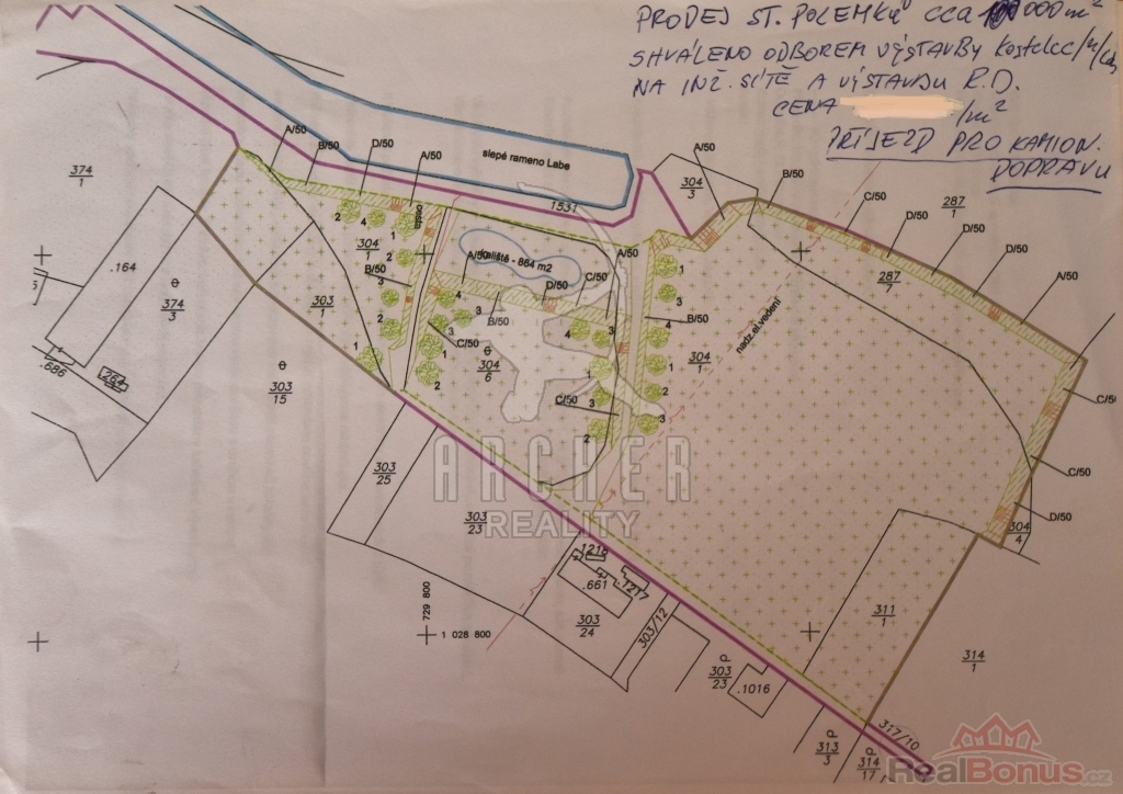 Nabízíme k prodeji soubor pozemků 80 085 m2, elektřina, kanalizace, voda, Kostelec nad Labem (okres Mělník), ul. Neratovická. Jedná se o soubor pozemků mezi původním areálem cukrovaru a přístavem na Labi v Kostelci nad Labem - Jiřicích, který byl využíván pro nákladní přepravu. Pozemky jsou min. 8 m nad hladinou Labe, 60 000 m2 komerčních a 20 000 m2 stavebních na rodinné domy. Je vypracován projekt komunikací a sítí po areálu a příjezd pro kamionovou dopravu, dle územního plánu se jedná o komerční pozemky pro umístění zařízení průmyslové výroby a skladování, 50% zastavěnost, 30% pozemku nezpevněných ploch pro zeleň, výška hal dle okolní zástavby až 15 m. V případě zájmu lze pozemky dělit na menší plochy.