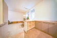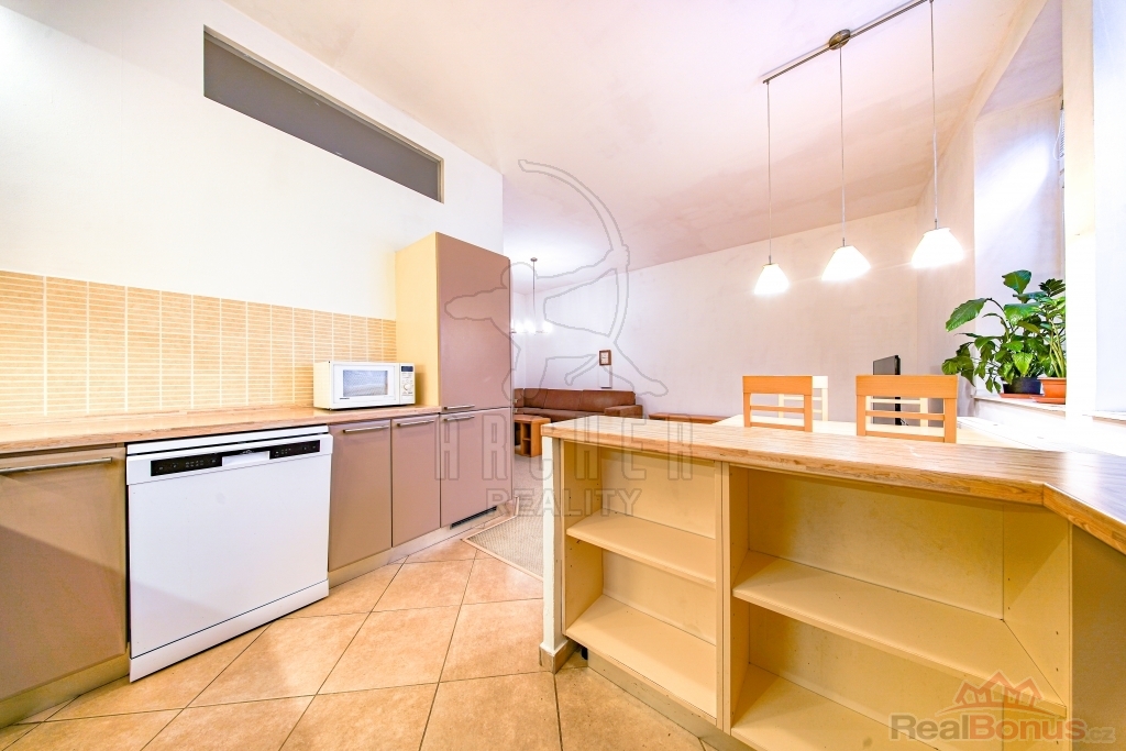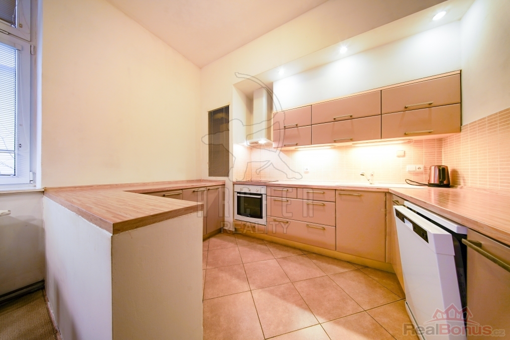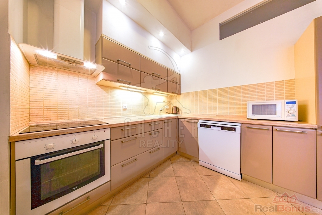Pro dokonalé využití prostoru je kuchyň zhotovena na míru. Je zde sporák s odsavačem par, prostorná pracovní deska je rozdělena na dvě části, uprostřed se nachází dřez s odkapávačem. Linka je vybavena i 60cm myčkou nádobí a ukončena vestavěnou lednicí vpravo. Barový pultík rozšiřuje prostor pro odkládání, ale zároveň ponechává prostor vzdušný a otevřený.