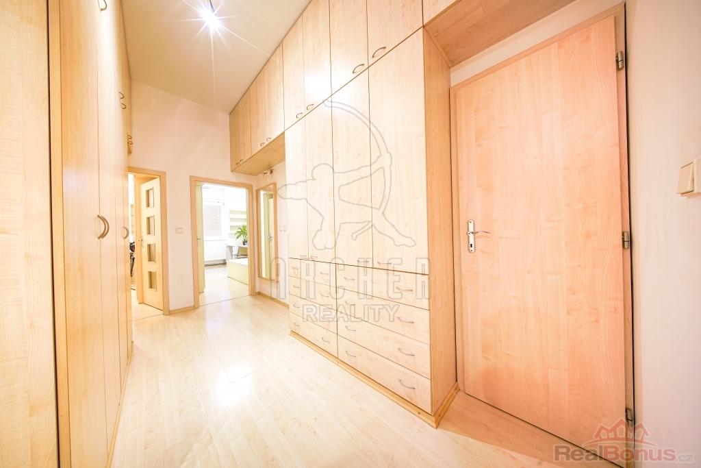 Do bytu vstupujeme prostornou předsíní, ve které je systém vestavných skříní na míru. Zásadní výhodou bytu jsou 3,15m stropy, které umožňují získat neuvěřitelné množství úložného prostoru.
