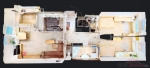 Byt je chytře vymyšlen pro rodinu se dvěma dětmi. Do obývacího pokoje s okny do dvora na východní stranu je vestavěna ložnice rodičů, kterou lze od společného prostoru oddělit prodyšnými posuvnými zástěnami. Obývací pokoj má jasně vymezené zóny - odpočinkovou s prostorným gaučem, jídelní se stolem pro 4 osoby (stůl je ale rozkládací, počítá se i s možností usazení více hostů) a konečně kuchyňský kout, který je ve skutečnosti plnohodnotnou kuchyní oddělenou barovým pultíkem.